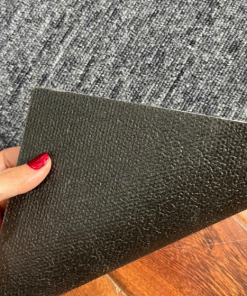 Hình ảnh thảm trải sàn dạng tấm đế cao su PVC cao cấp Mana 09 cho thấy mặt đế thảm với chất liệu cao su PVC màu đen, có kết cấu bề mặt chống trượt, đảm bảo độ bám chắc trên sàn nhà. Phần mặt trên của thảm (phía nền trong hình) có tông màu xám đậm, mang lại vẻ đẹp hiện đại và thanh lịch. Đế cao su PVC không chỉ giúp thảm cố định tốt trên các bề mặt sàn như gỗ hoặc gạch mà còn tăng độ an toàn, đặc biệt cho gia đình có trẻ nhỏ hoặc người lớn tuổi. Thiết kế này kết hợp giữa tính thẩm mỹ và chức năng, lý tưởng cho các không gian sống và làm việc hiện đại.