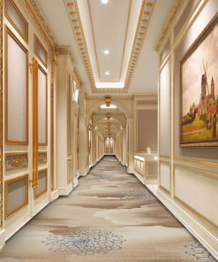 Bề mặt thảm mô phỏng những đám mây và khối ánh sáng loang, tạo chiều sâu thị giác và cảm giác sang trọng không phô trương, rất phù hợp với không gian khách sạn theo phong cách cổ điển – tân cổ điển.