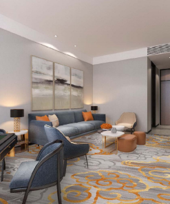 Với sắc xám nền chủ đạo làm nổi bật các họa tiết mây cam – vàng, thảm mang đến cảm giác cân bằng giữa sự sang trọng và ấm áp, giúp không gian nghỉ ngơi trở nên gần gũi nhưng không kém phần đẳng cấp.